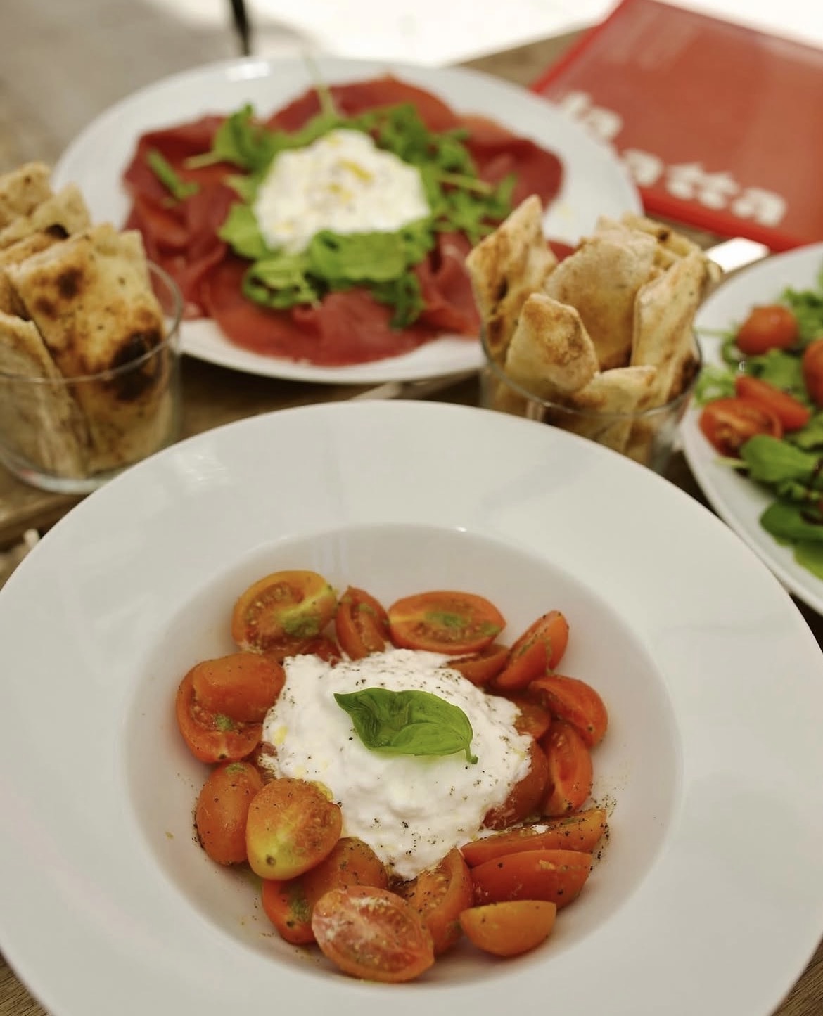 Amalfi: Tomate, stracciatella de burrata, anchovas, tomate cherry, azeitonas, raspas de limão